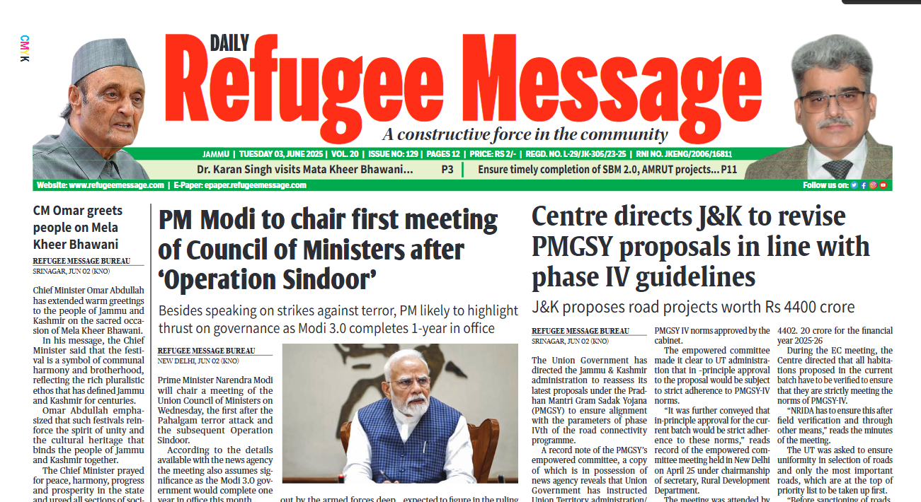 Refugee Message is the leading newspaper of Jammu & Kashmir, known for its credible journalism, in-depth reporting, and balanced coverage of regional, national, and international affairs. With a strong presence both in print and digital media, it serves as a trusted source of news for millions, capturing the pulse of the Valley while giving voice to the people and issues that matter most.